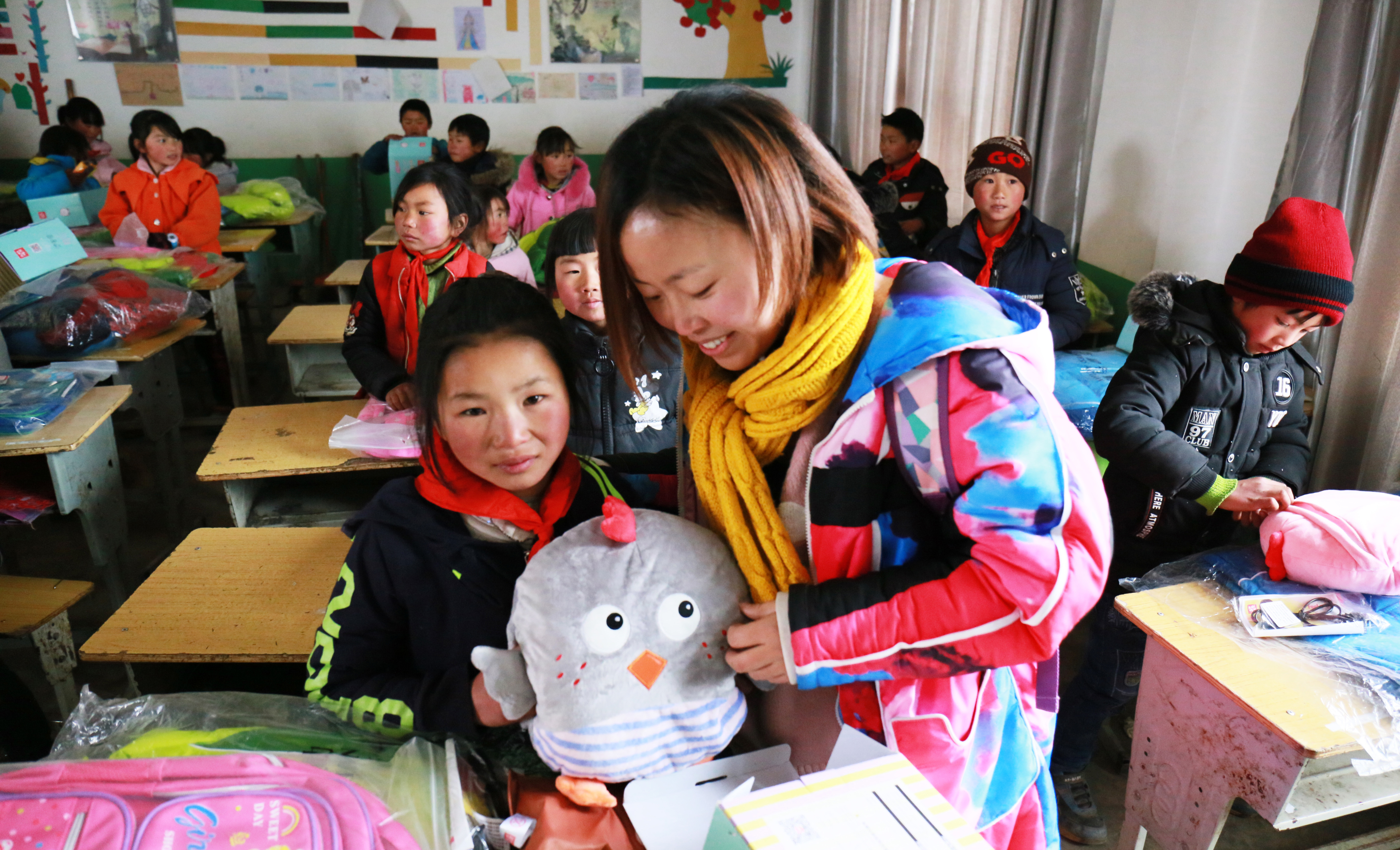 上圖均為志愿者為孩子們獻(xiàn)愛(ài)心,送上學(xué)習(xí)和取暖用品
